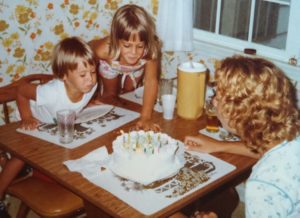 Helping Mom blow out her birthday candles. From across the table. Two little kids competing to extinguish the most the fastest. Good thing it’s just family. ‘We all have the same germs’ my mom used to say.