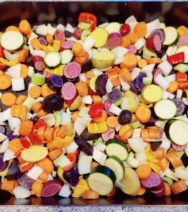 Fill a large roasting pan with chopped veggies.